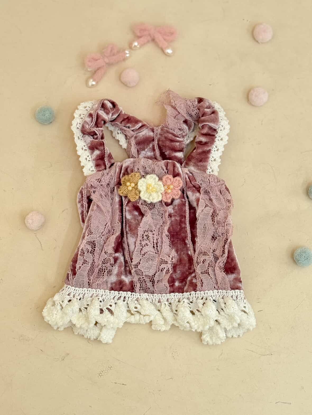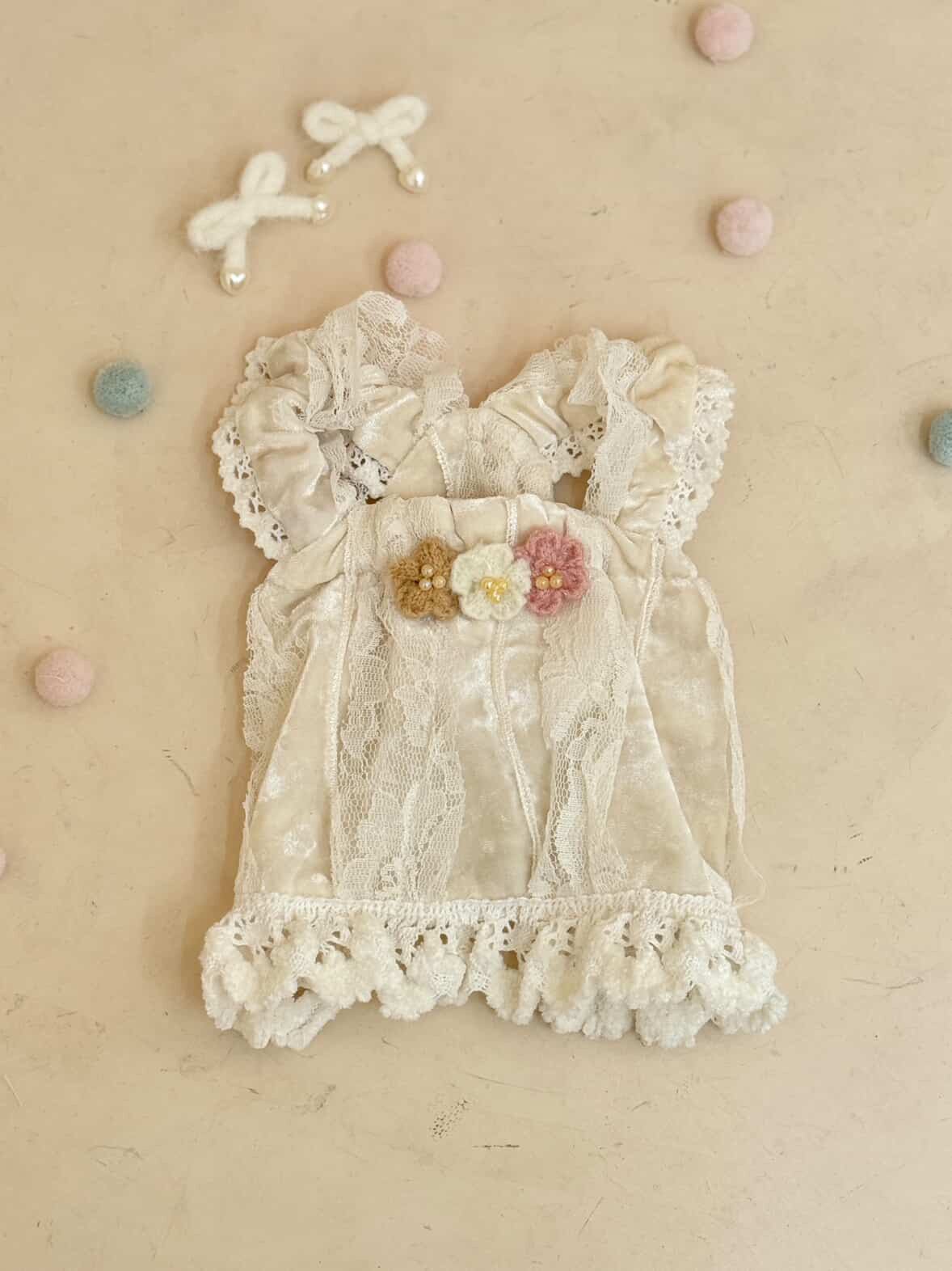 ボリュームのあるプリーツのディテール、ハンドメイドの花飾り、そしてドレープレースを一枚のベルベットに織り込んだデザインは、小さめのシルエットながらも印象的な存在感を放ちます。