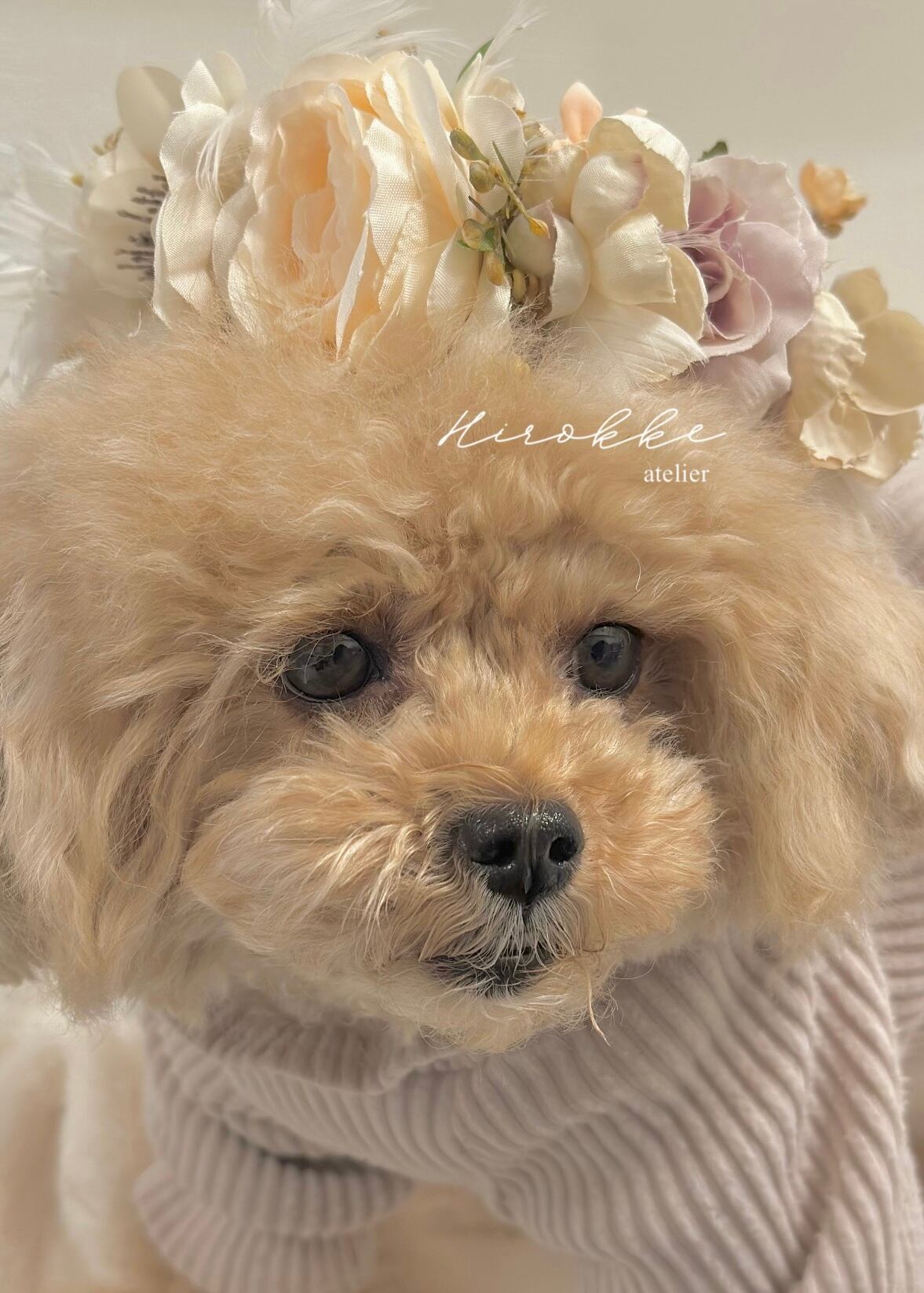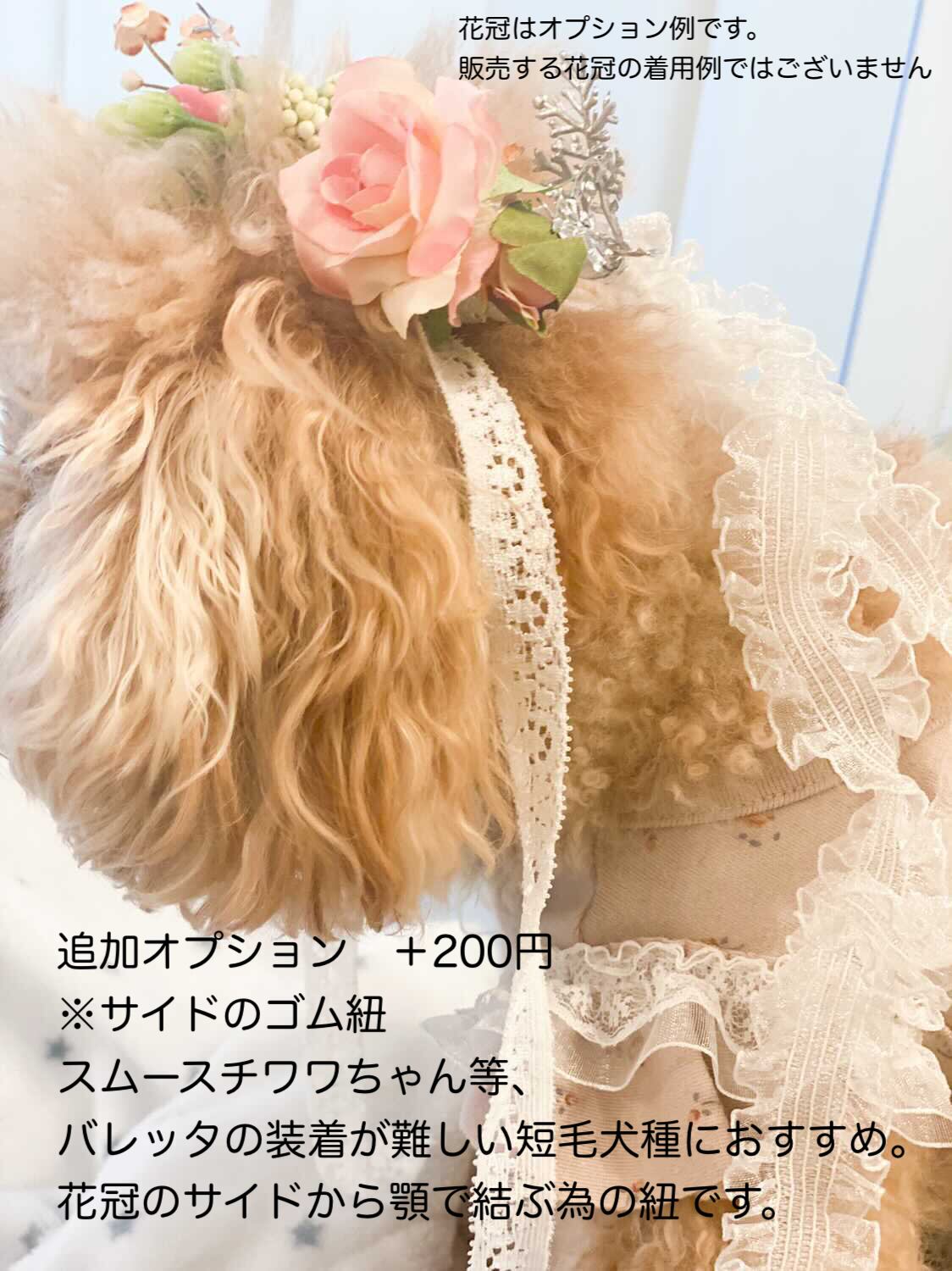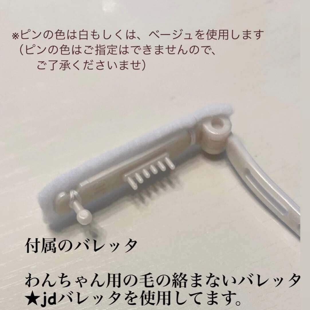 ✔︎また、首元での固定用の他に、頭部(顔の上)に毛が絡まないわんちゃん用のバレッタをつけてあり、花冠を固定できるようにしております。