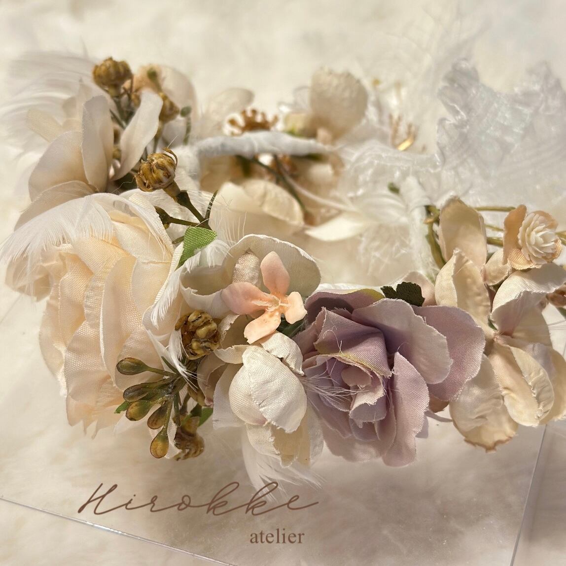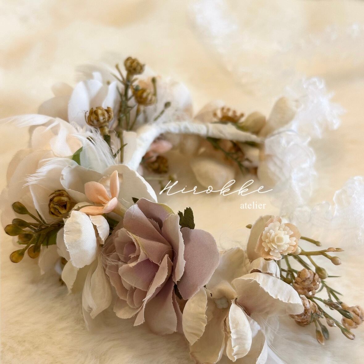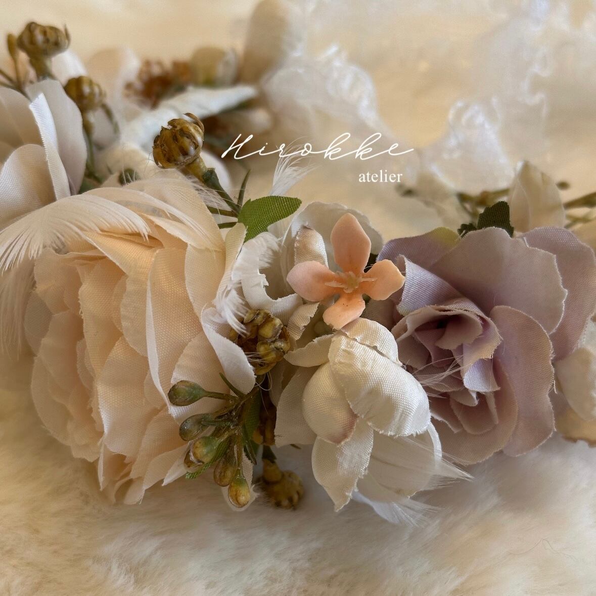 花冠の色味はくすみカラーを中心に製作しましたが、花冠をつける位置などで雰囲気が変わるようにグラデーションになっています。