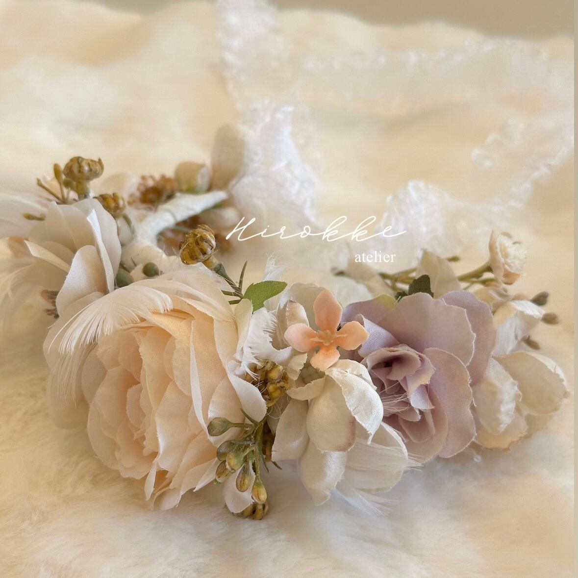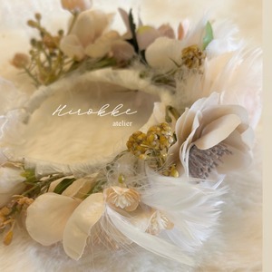 やわらかなアイボリーホワイトトーンの花々に、ふんわりと揺れる羽根を添えた
