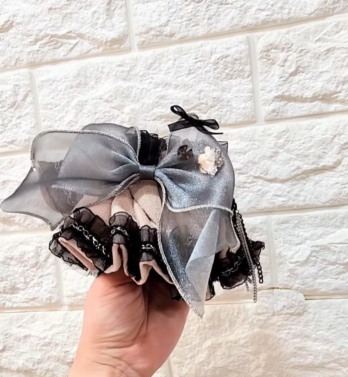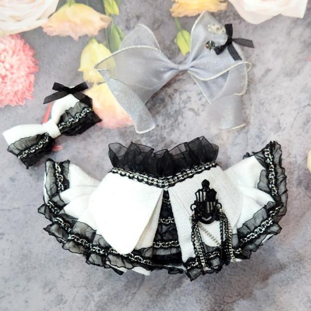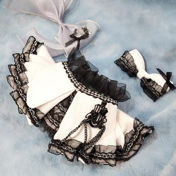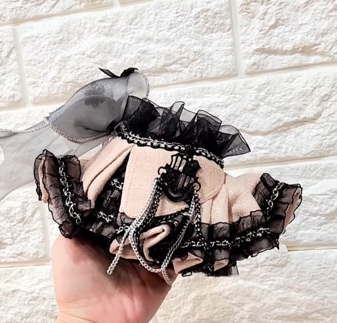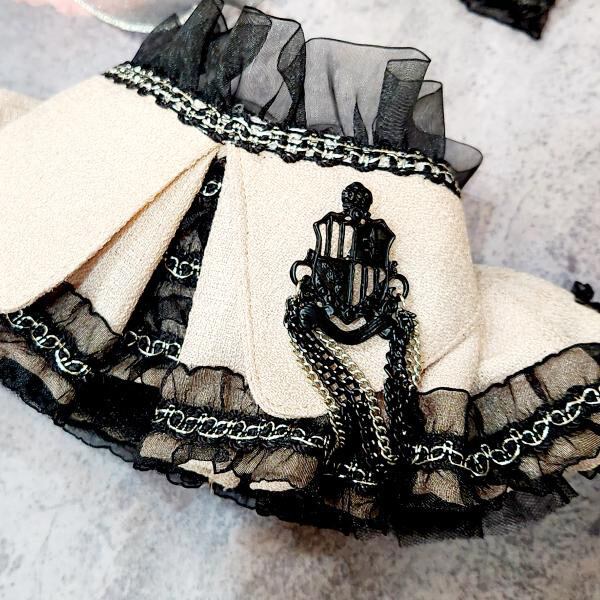 柔らかく繊細な生地に、繊細なブラックのフリルとチェーンのディテールがあしらわれ、洗練されたエレガントな雰囲気を醸し出します。