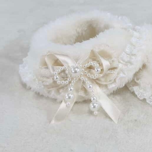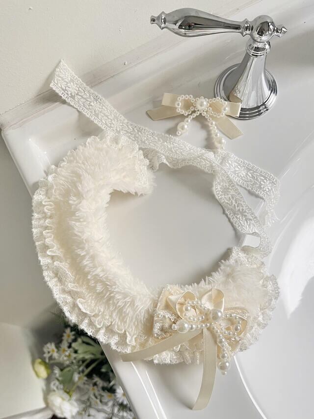 レースとパールの装飾は、自然な流れのファーの質感に控えめに配置され、