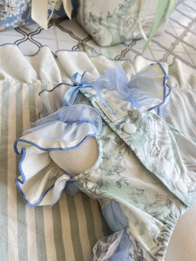 Blue:セージトーンベースに澄んだソラブルーのメッシュとリボンが調和し、爽やかな空気を含んだようなカラー。