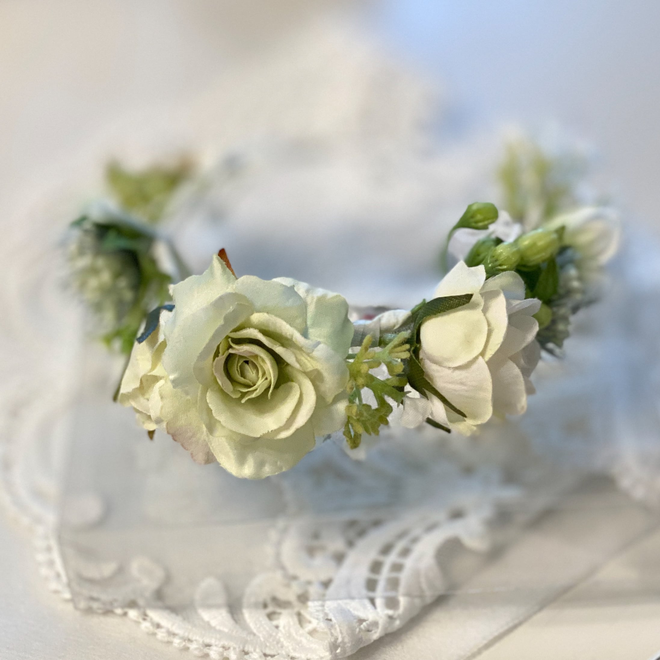✔︎ 花かんむりの強度をあげるため、フローラルテープを使用しております。素材の性質上、少々ベタつきがありますが、わんちゃん達の頭に違和感なくつけてもらえるよう、花冠の内側には優しい生地のレースをつけております。