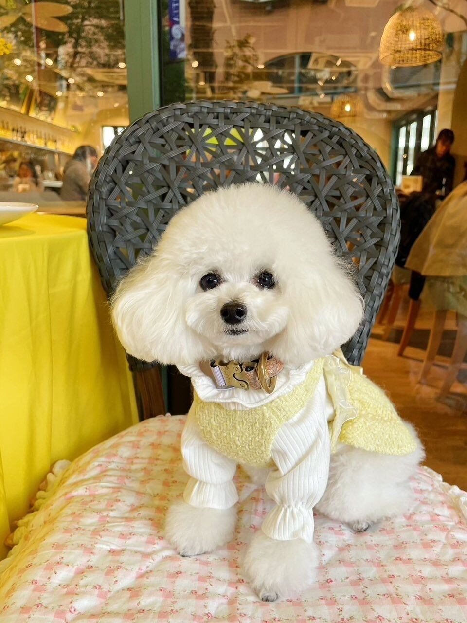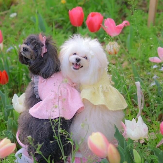 春コーデ 犬と花 春服